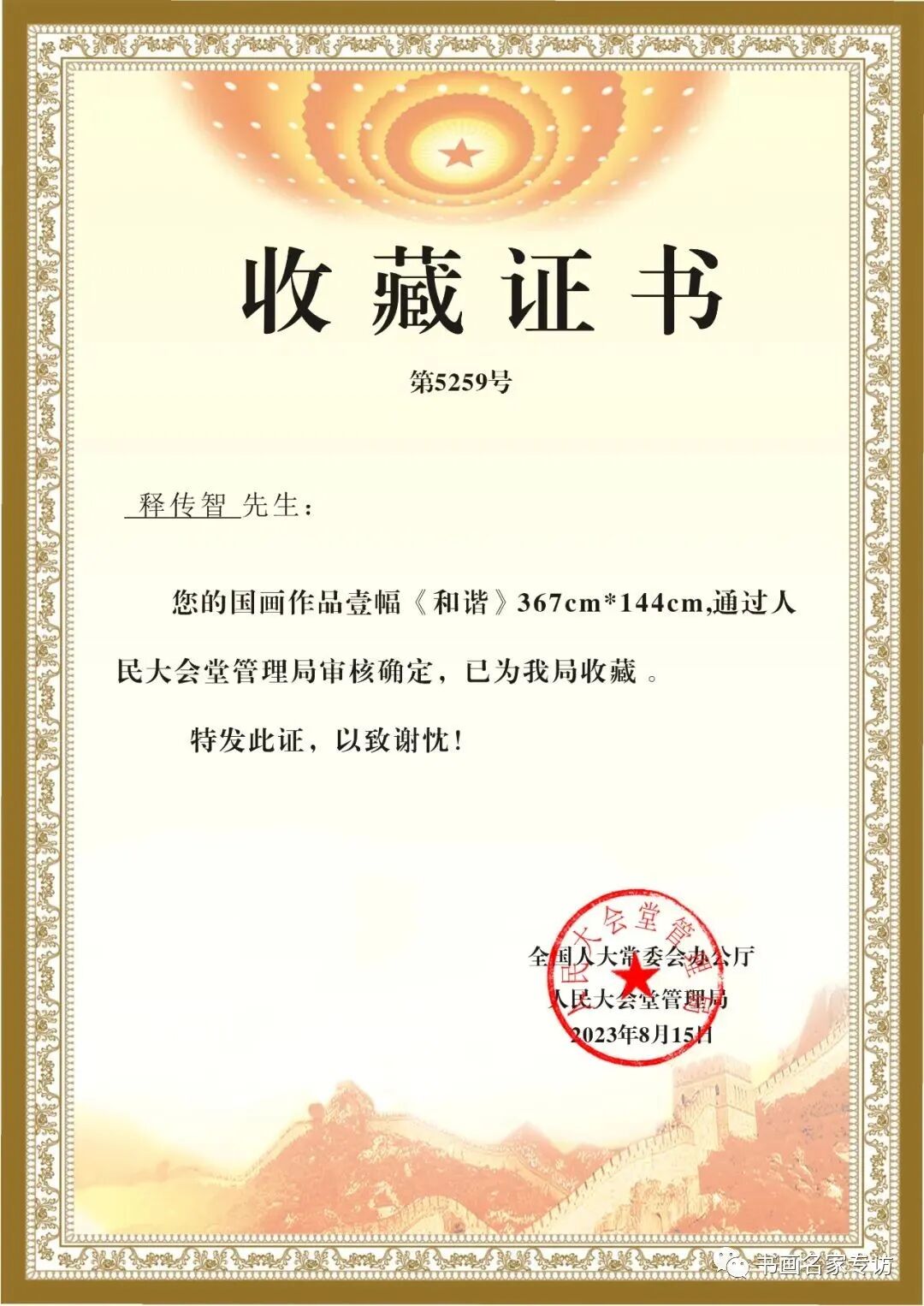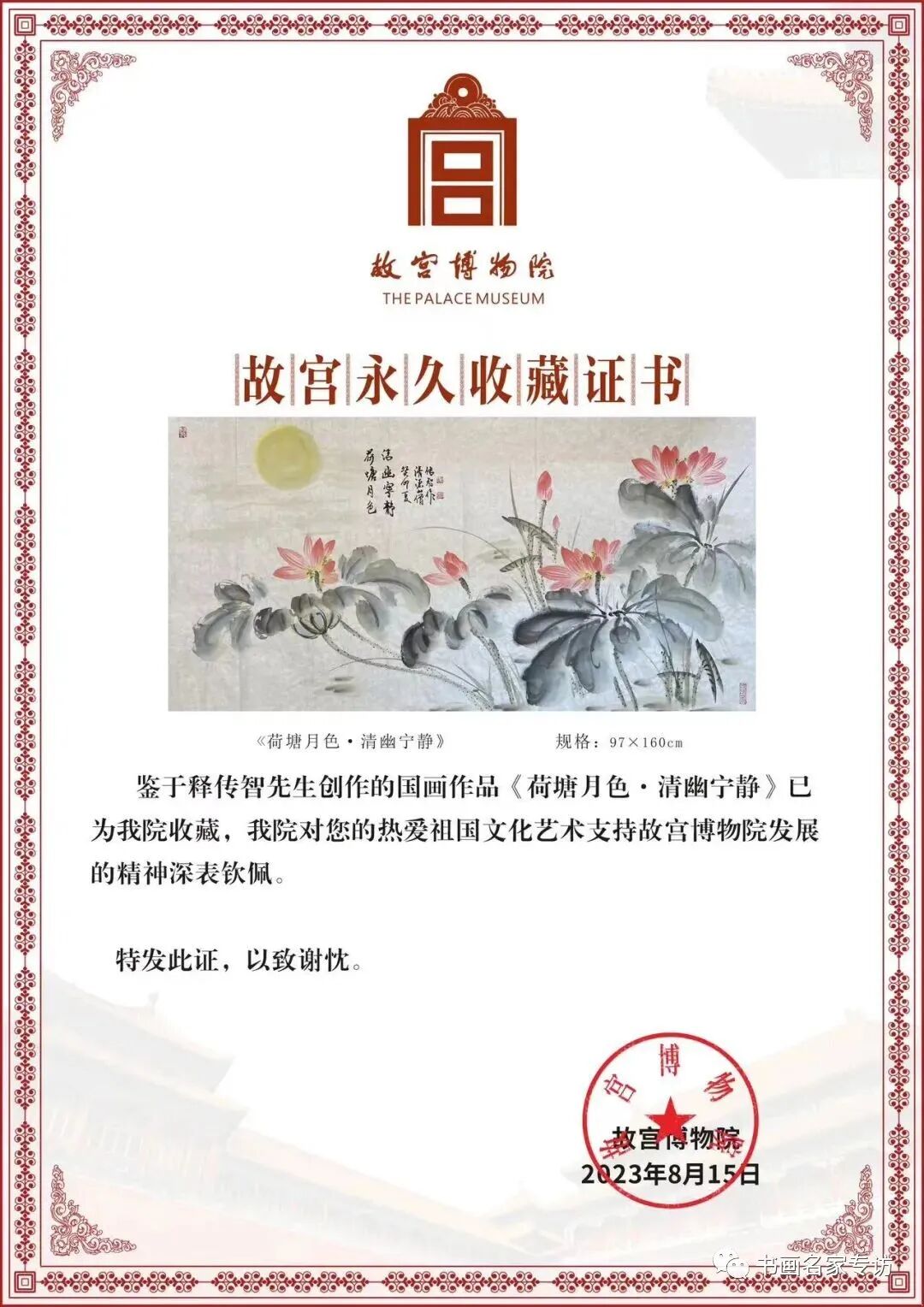 今年8月15日国画作品《和谐》和《荷塘月色·清幽宁静》分别被人民大会堂和故宫博物院收藏,这份荣誉令他倍受鼓舞。